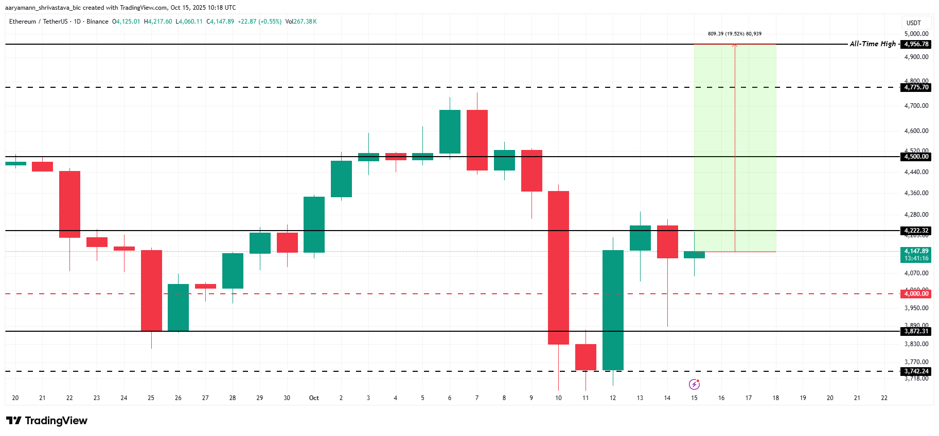 이더리움은 현재 4,147달러에 거래되고 있으며, 주요 저항선인 4,222달러 바로 아래에 있습니다. 이 장벽을 성공적으로 돌파하면 ETH는 4,500달러로 상승할 수 있습니다. 이는 기관 및 개인 투자자 모두에게 강력한 자금 유입을 유도할 것입니다.