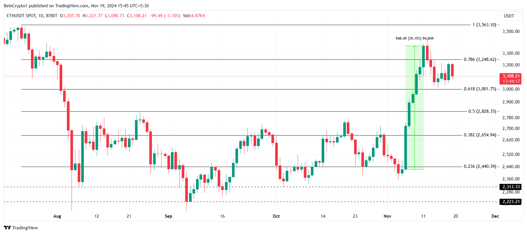 이더리움은 현재 3108달러에 거래되고 있으며, 중요한 지지선인 3001달러 이상에서 안정적으로 유지되고 있습니다. 이 수준은 황소 시장 지지 바닥으로 알려진 61.8% 피보나치 되돌림선과 일치하여 잠재적인 이득을 위한 안정적인 기반을 제공합니다.