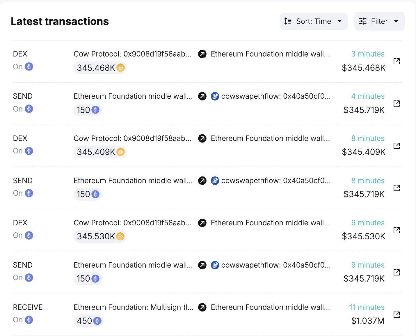 또한, 이더리움 재단은 450 ETH를 103만 달러 상당의 DAI로 판매하여 가격 압력에 대한 우려를 더욱 부추겼습니다.