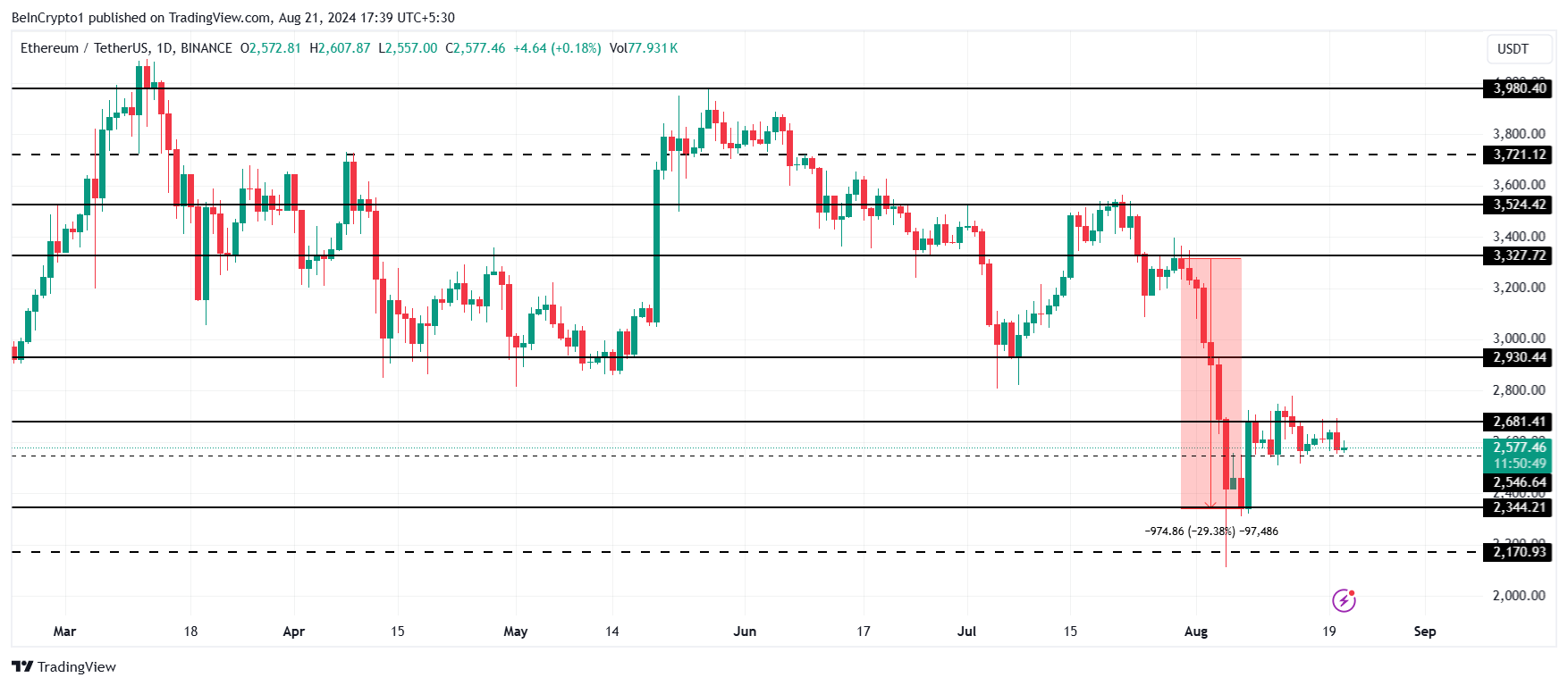 이더리움의 현재 가격은 2577달러로, 2681달러와 2546달러 사이에서 횡보하고 있습니다. 이 단기 안정은 지난 2주 동안 ETH를 유지했습니다.