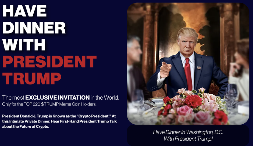 공식 규칙에 따르면, 5월 22일까지 상위 220명의 TRUMP 토큰 보유자가 저녁 식사 자격을 얻습니다. 상위 25명은 VIP 백악관 투어도 받습니다.