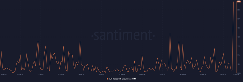 Santiment의 데이터에 따르면, 6월 17일에 팬텀 네트워크의 NVT 비율은 갑자기 2,997로 치솟았습니다. 이러한 전례 없는 급등은 블록체인에서 유통되는 토큰에 비해 암호화폐가 고평가되어 있다는 것을 의미합니다.
