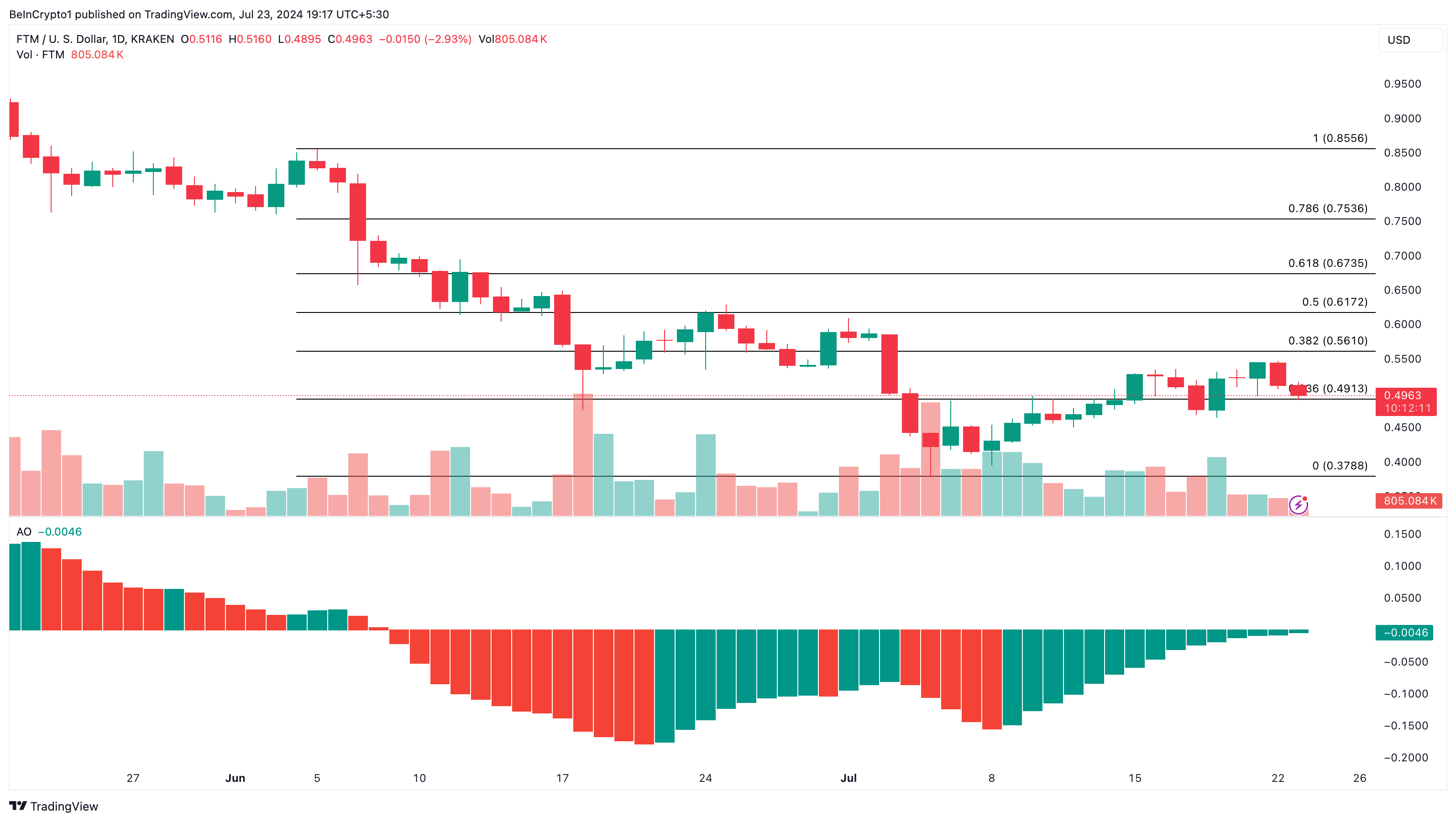 그러나 하락세가 다시 상승세를 주도하고 모멘텀이 하향 추세를 보인다면 상승 논리는 현실화되지 않을 수 있습니다. 대신 FTM은 0.49달러까지 하락할 수 있습니다.