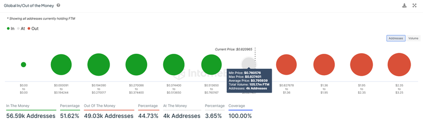 글로벌 인/아웃 오브 더 머니(GIOM) 지표에 따르면, 팬텀의 가격이 0.82달러를 넘으면 8,400만 달러 상당의 공급량이 이익을 얻게 됩니다. 이는 공급량이 $0.76에서 $0.82 사이에 매수되었기 때문입니다.