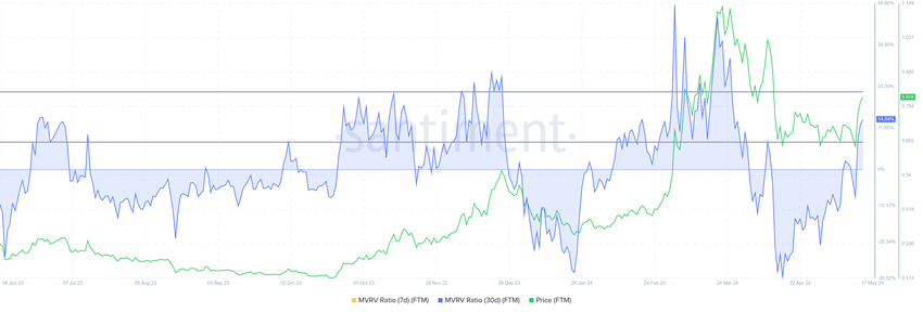 시장가치 대비 실현가치(MVRV) 비율이 이를 뒷받침합니다. MVRV 비율은 투자자의 수익과 손실을 측정합니다. 팬텀의 30일 MVRV 14%는 수익성을 나타내며, 이는 매도를 촉발할 수 있습니다. 역사적으로 FTM 조정은 위험 구간으로 알려진 7%~21% MVRV 범위 내에서 발생했습니다.