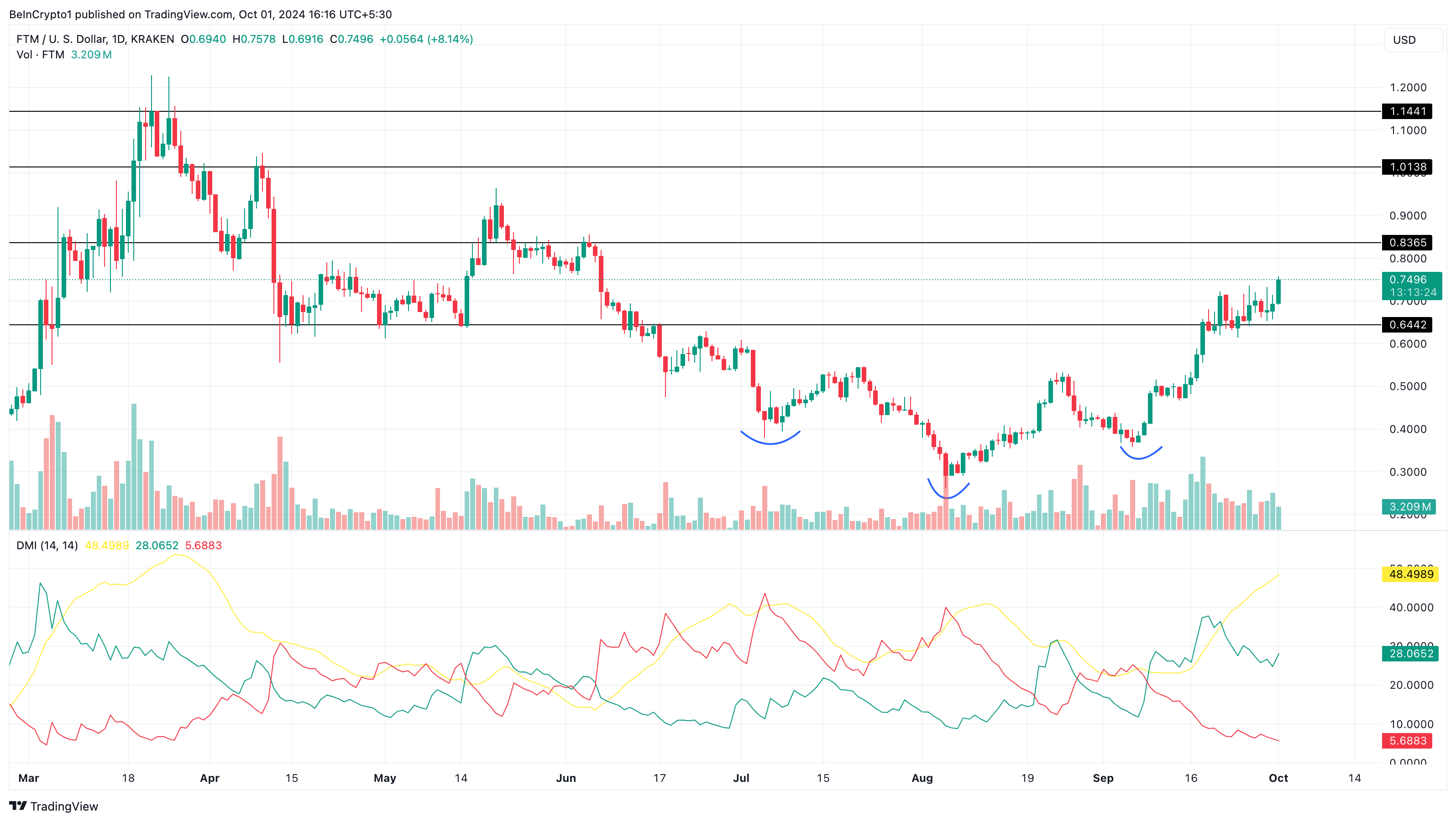 일일 차트에서, FTM의 가격은 상승 반전 머리어깨 패턴이 형성된 후 증가했습니다. 현재 0.75달러에 거래되고 있으며, BeInCrypto는 방향성 운동 지수(DMI)를 검토하여 알트코인의 상승 추세 지속을 지지합니다.