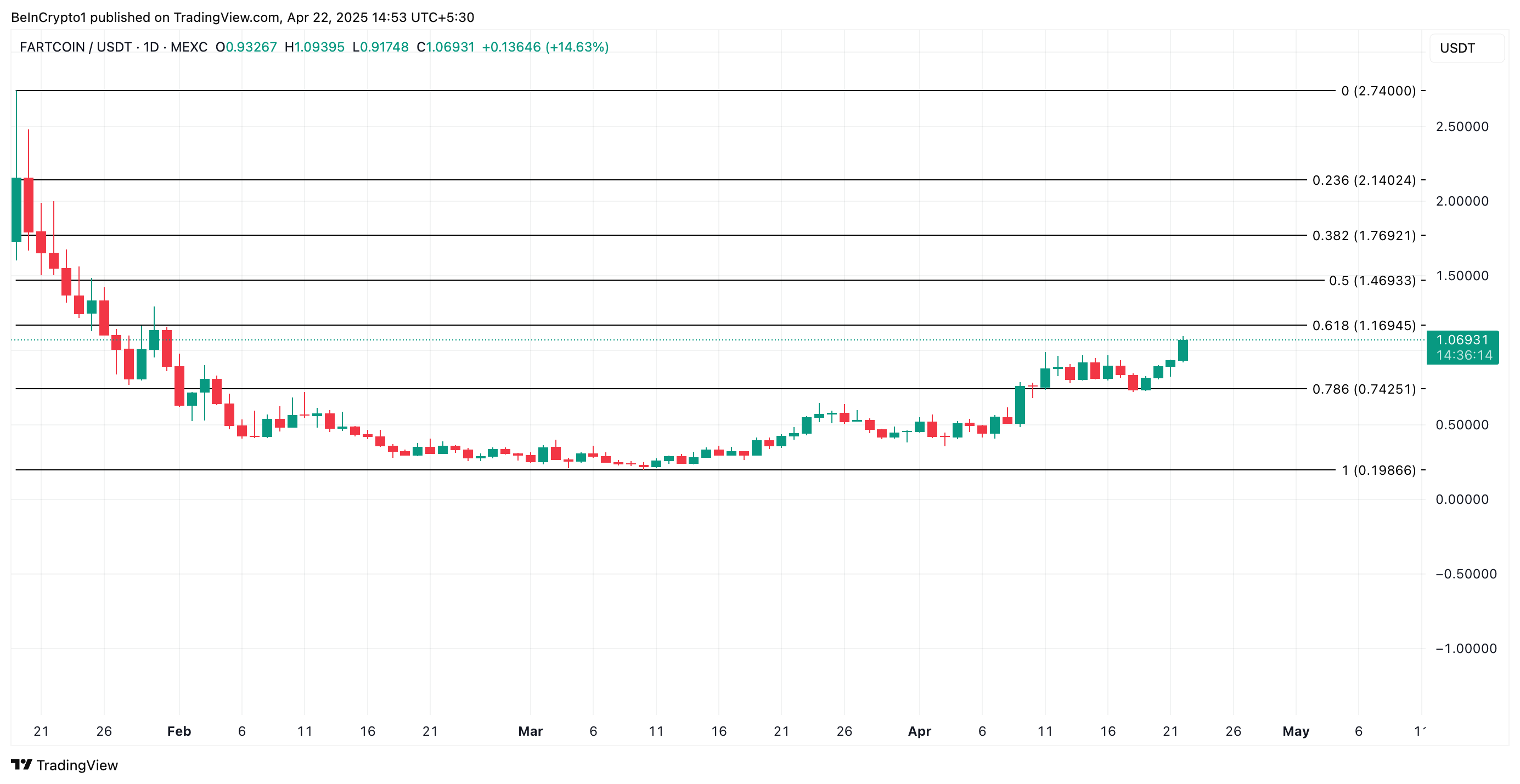 현재 FARTCOIN은 1.06달러에 거래되고 있으며, 주요 저항 수준인 1.16달러 바로 아래에 있습니다. 수요가 강해지고 밈코인이 이 가격 수준을 지지선으로 전환할 수 있다면, 랠리가 탄력을 받아 가격이 1.46달러로 상승할 가능성이 있습니다.