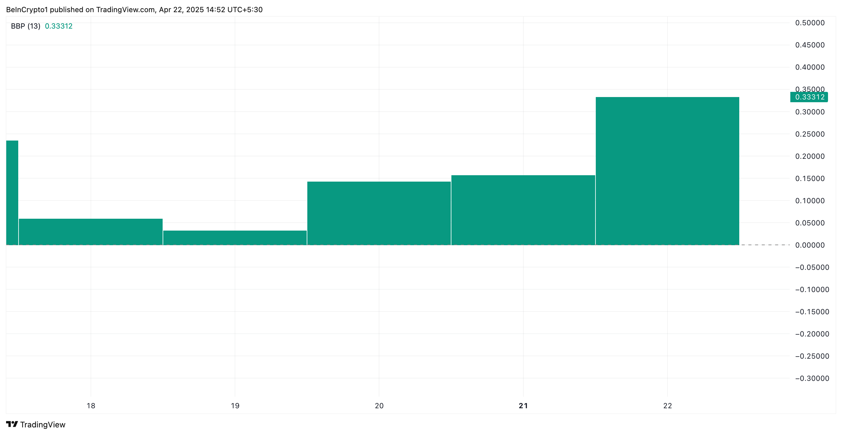 Sponsored엘더-레이 지수는 자산의 고가와 저가를 이동평균선(EMA)과 비교하여 매수자(강세력)와 매도자(약세력)의 강도를 측정합니다. 값이 양수일 때, 강세력이 지배적입니다.