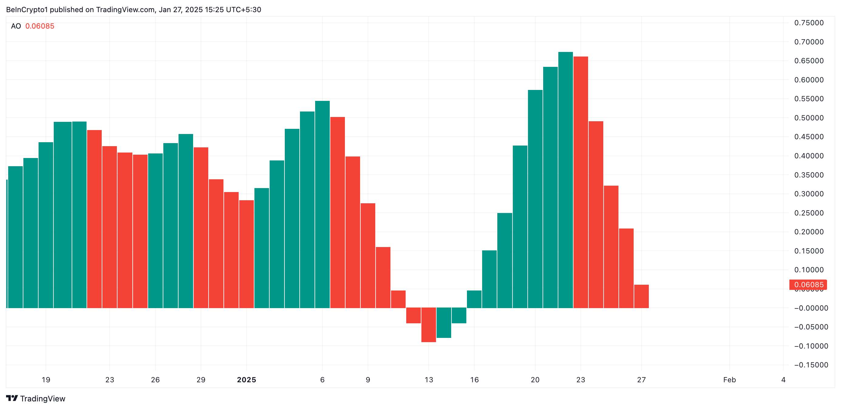 어썸 오실레이터는 시장 강도를 측정하고 트렌드와 잠재적 반전을 식별하는 모멘텀 지표입니다. 빨간색 히스토그램 막대가 나타나면 이전 막대에 비해 모멘텀이 감소하고 있음을 나타냅니다. 이는 현재 트렌드의 약화 또는 약세 심리로의 전환을 신호합니다.