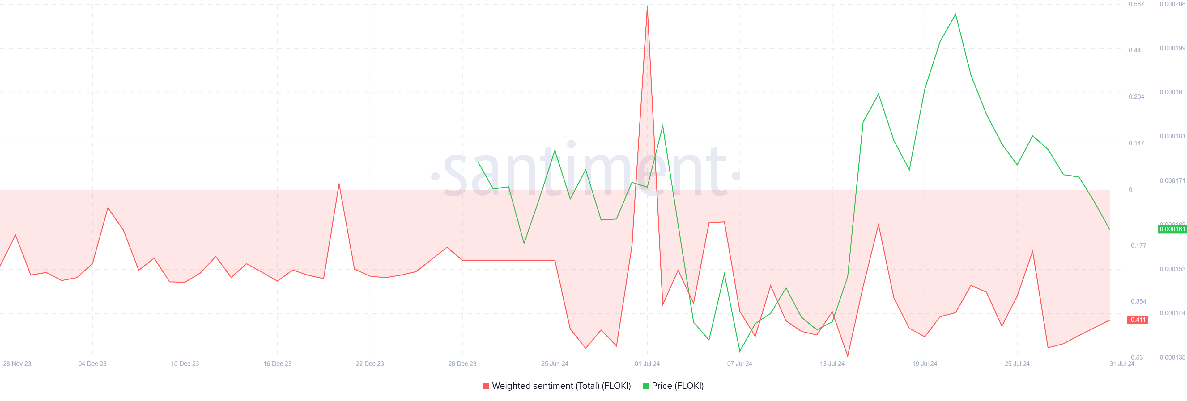 투자자들은 분명히 이런 일이 일어나기를 원하지 않을 것이지만, 그들의 감정은 다르게 전달됩니다. 가중 감정 지표에 따르면, 플로키 보유자들 사이에서는 약세가 심합니다.
