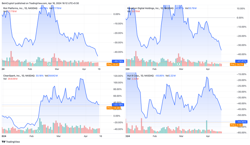 올해 라이엇 플랫폼(RIOT), 마라톤 디지털 홀딩스(MARA), 헛 8 코프(HUT)와 같은 비트코인 채굴자들은 주가가 크게 하락했습니다. 올해 들어 이들 주식의 주가는 최소 47% 하락했습니다.