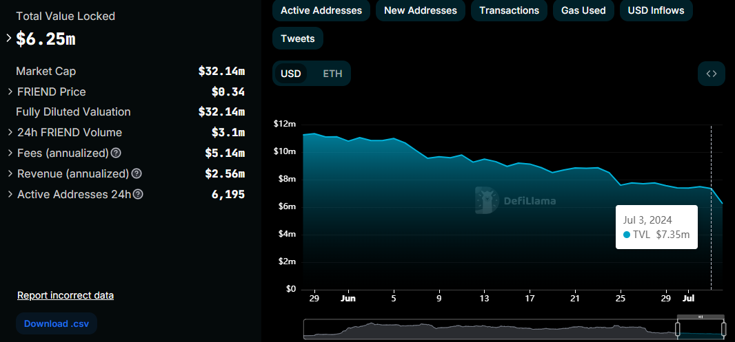 그 이후로 Friend.tech 총예치량(TVL)은 330만 달러 감소했으며, 더 이상 이전하지 않겠다는 발표로 인해 지난 24시간 동안 110만 달러 이상 급락했습니다.