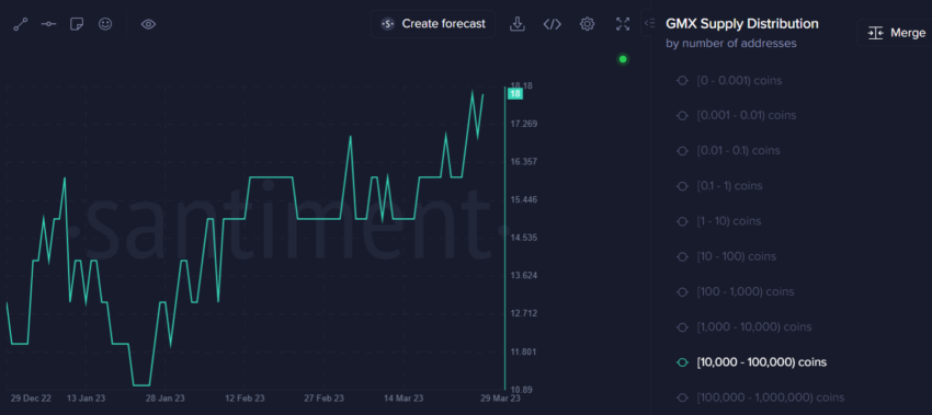 최근 GMX 고래들의 축적 추세는 지난 한 주 동안 GMX 가격 상승을 이끈 또 다른 중요한 지표이다. 샌티먼트 데이터에 따르면, 1만~10만 GMX를 보유한 고래들이 이번주 잔고에 3만4400개의 토큰을 추가하여 총 265만달러 어치의 토큰을 보유한 것으로 나타난다.