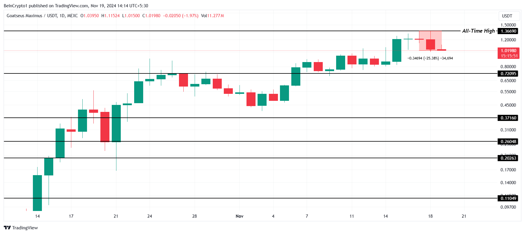 GOAT의 가격은 지난 24시간 동안 25% 하락하여 사상 최고가 1.36달러에서 1.01달러로 떨어졌습니다. 자산이 중요한 1.00달러 선에 근접함에 따라, 약세 동력이 지속된다면 추가 하락이 예상됩니다.