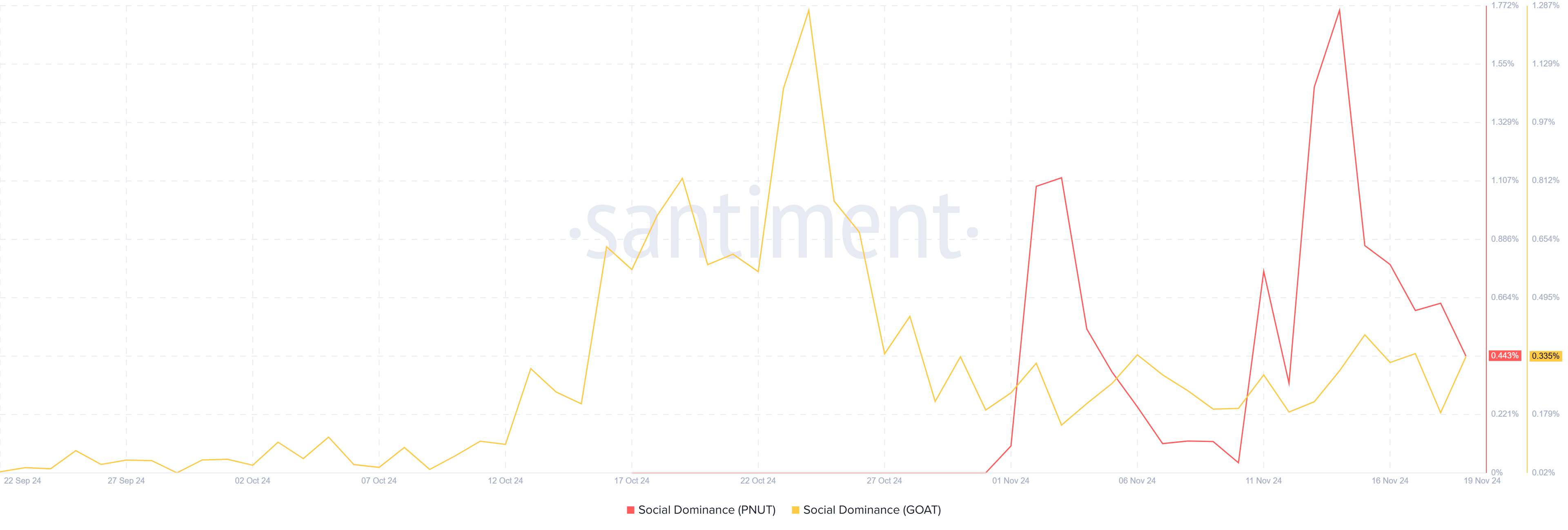 10월 이후 GOAT의 사회적 영향력은 PNUT의 등장으로 크게 변화하였습니다. 10월 대부분 동안 GOAT는 시장의 주목을 받으며 강한 투자자 관심과 높은 관심을 누렸습니다. 그러나 PNUT의 월말 데뷔는 주목을 받으며 GOAT를 인기 토큰에서 밀어냈습니다.