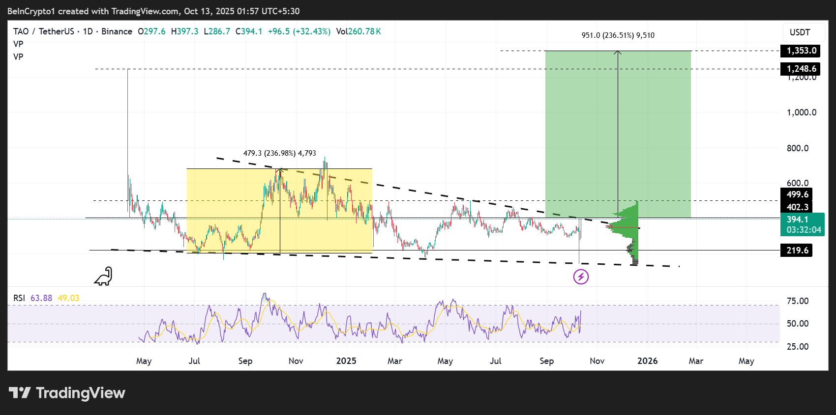 기술적 관점에서 TAO의 가격 차트는 하락 쐐기형 패턴을 형성하고 있으며, 이는 종종 상승 반전의 전조입니다. 특히, TAO/USDT 거래 쌍은 2024년 10월부터 하락 쐐기형 내에서 조정에 들어가고 있으며, 기술적 형성이 채워짐에 따라 TAO 가격의 돌파가 임박할 수 있습니다.