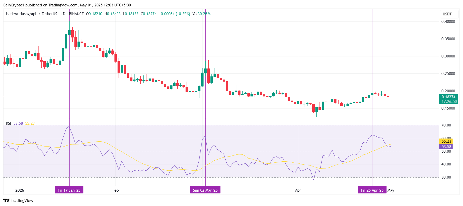 HBAR의 상대강도지수(RSI)는 현재 50.0의 중립점을 넘어서 있으며, 이는 긍정적인 시장 심리를 나타냅니다. 일반적으로 이는 상승 신호로 간주됩니다. 그러나 과거 사례에서는 HBAR가 변동성 있는 가격 움직임에 의해 RSI 급등 후 조정을 겪은 적이 있습니다.