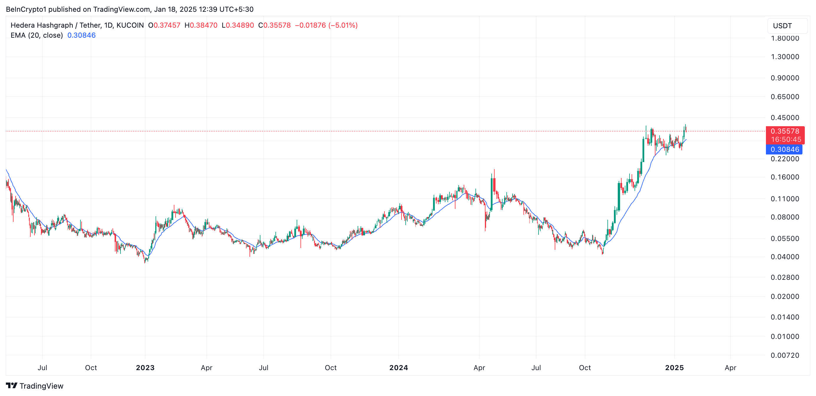 현재 HBAR는 보도 시점에 20일 이동평균선(EMA) 위에서 거래되고 있으며, 이는 강세 시장 추세를 반영합니다. 이 이동평균선은 최근 가격에 더 많은 가중치를 두어 단기 추세를 반영하며 자산의 지난 20일 동안의 평균 가격을 추적합니다.
