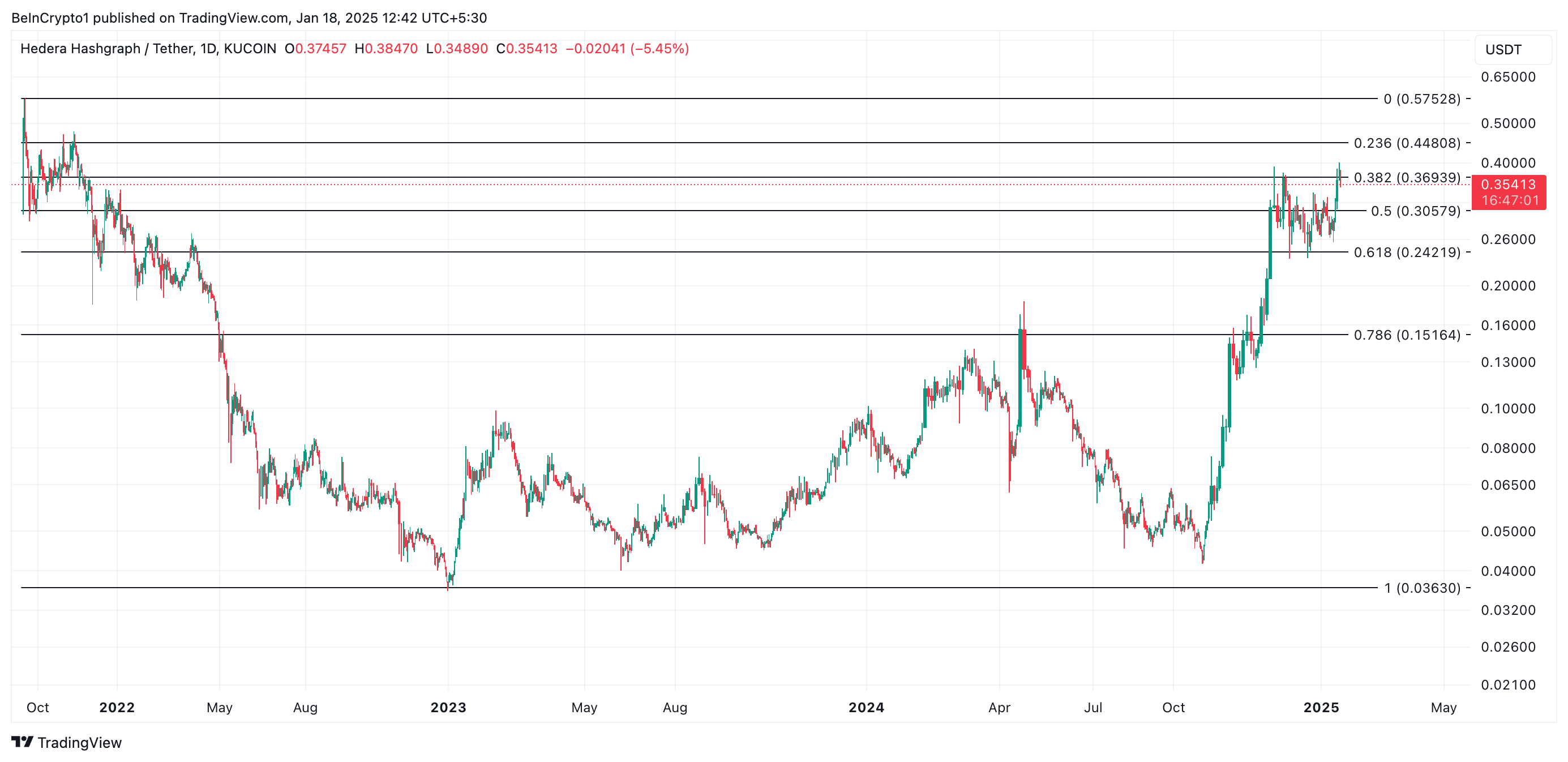 HBAR의 지속적인 수요는 가격을 0.44달러의 주요 저항 위로 끌어올릴 수 있습니다. 이 가격 수준의 성공적인 돌파는 알트코인이 4년 전 마지막으로 도달했던 0.57달러의 사상 최고치를 회복하는 데 필요한 지지를 제공할 수 있습니다.