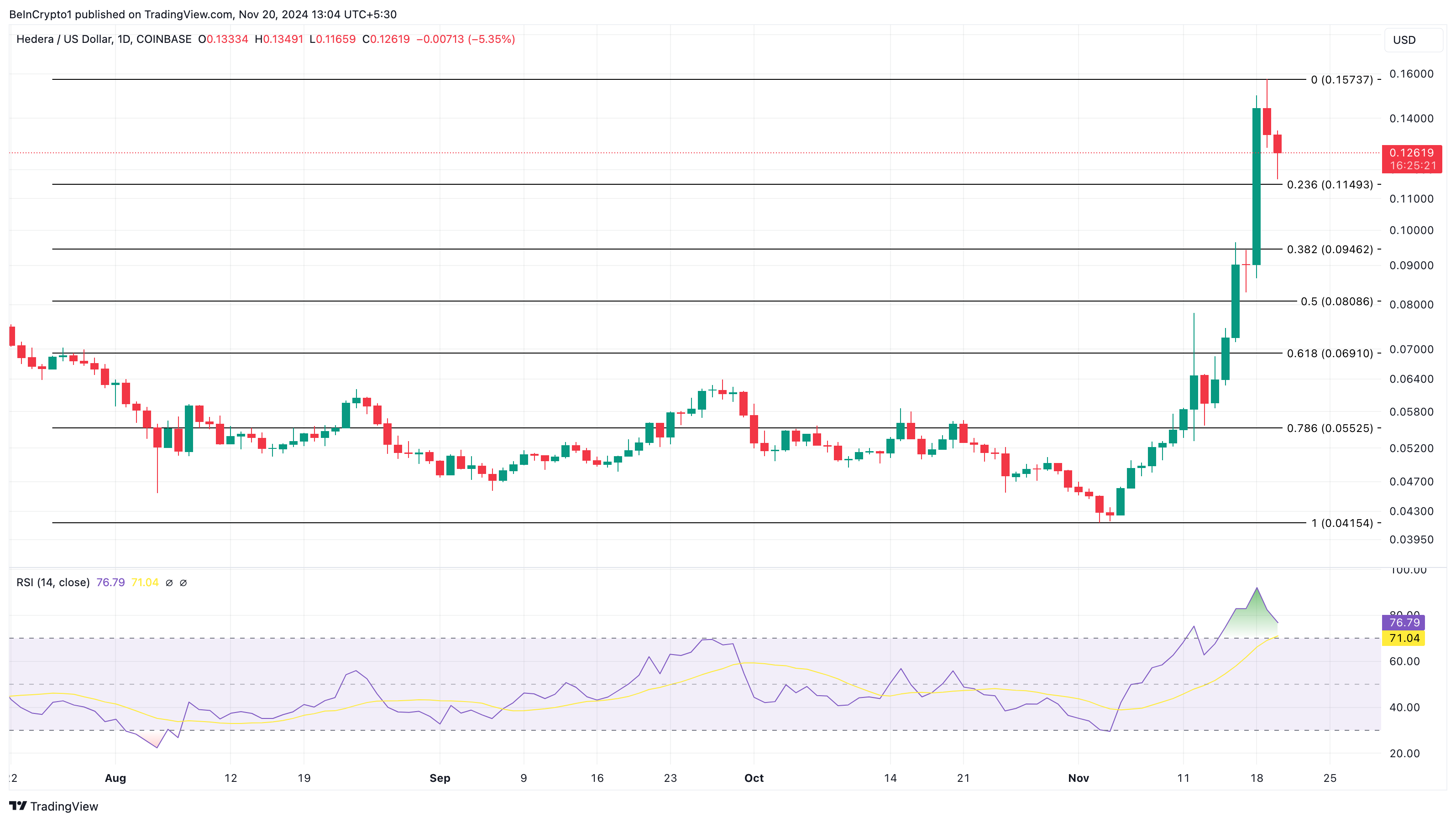기술적 관점에서 HBAR 가격 하락은 알트코인이 과매수 상태가 되었기 때문일 수 있습니다. 이는 모멘텀을 측정하는 상대 강도 지수(RSI)에 의해 나타났습니다.
