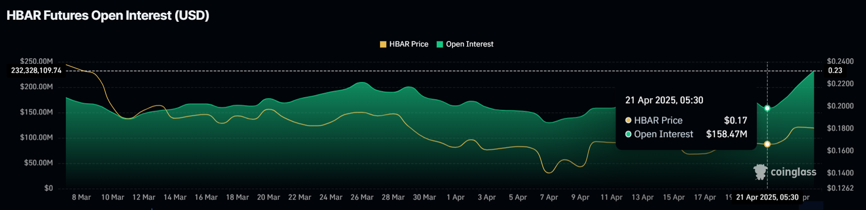 최근 HBAR 가격 상승은 미결제 약정(OI)의 큰 증가와 함께 이루어졌습니다. 최근 이틀 동안 46.8% 증가하여 현재 2억 3천 2백만 달러에 달합니다. 이는 거래자들이 적극적으로 상승세에 참여하고 있음을 나타냅니다.