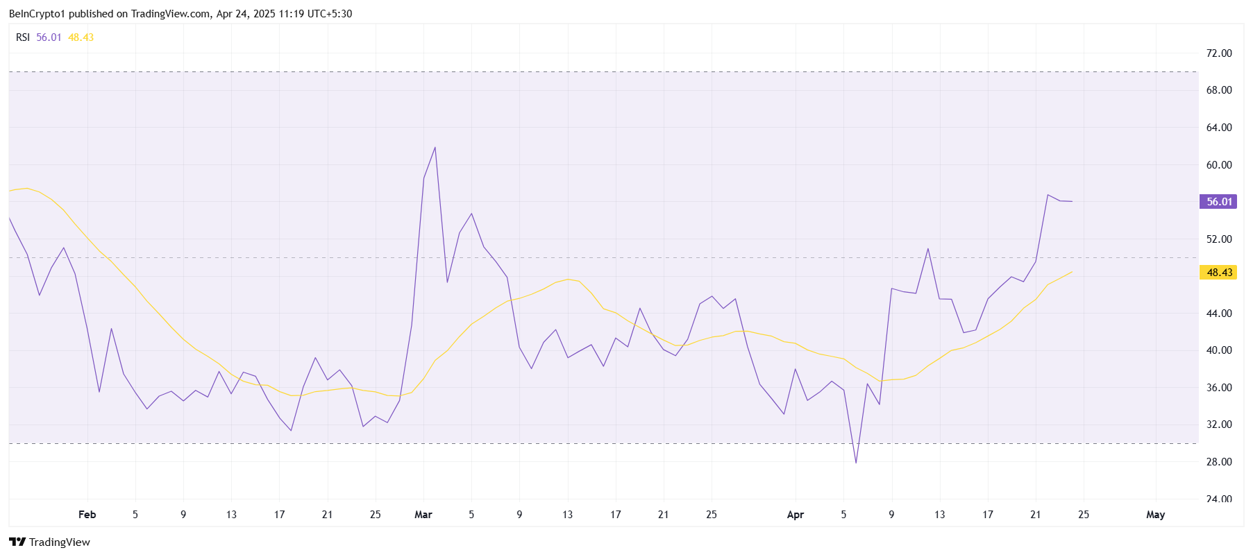 기술적 지표를 보면, HBAR의 상대 강도 지수(RSI)는 한 달 반 만에 최고점에 도달했습니다. 이는 강한 상승 모멘텀을 나타내며, HBAR가 계속해서 상승할 수 있음을 시사합니다. RSI가 상승 구간에 머무르면서, 거래자들은 이 긍정적인 모멘텀이 가격을 더 높일 수 있다고 낙관하고 있습니다.