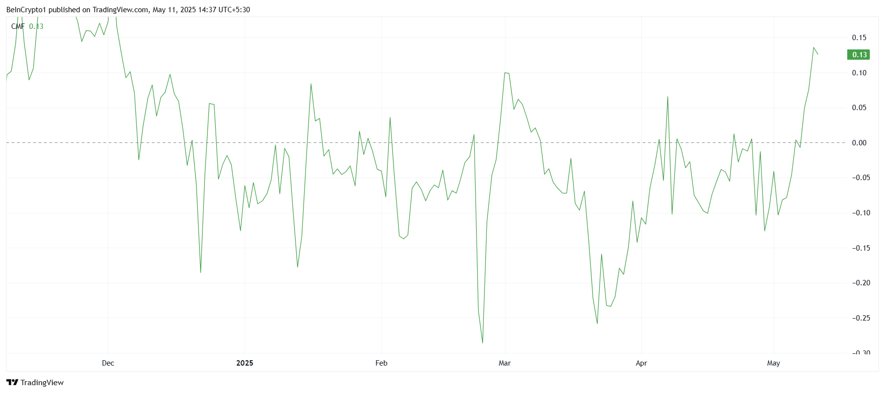 HBAR의 거시적 모멘텀은 긍정적인 기술적 지표에 의해 뒷받침되고 있습니다. 차이킨 머니 플로우(CMF)는 현재 급격한 상승세를 보이며 2024년 12월 이후 최고치를 기록하고 있습니다.