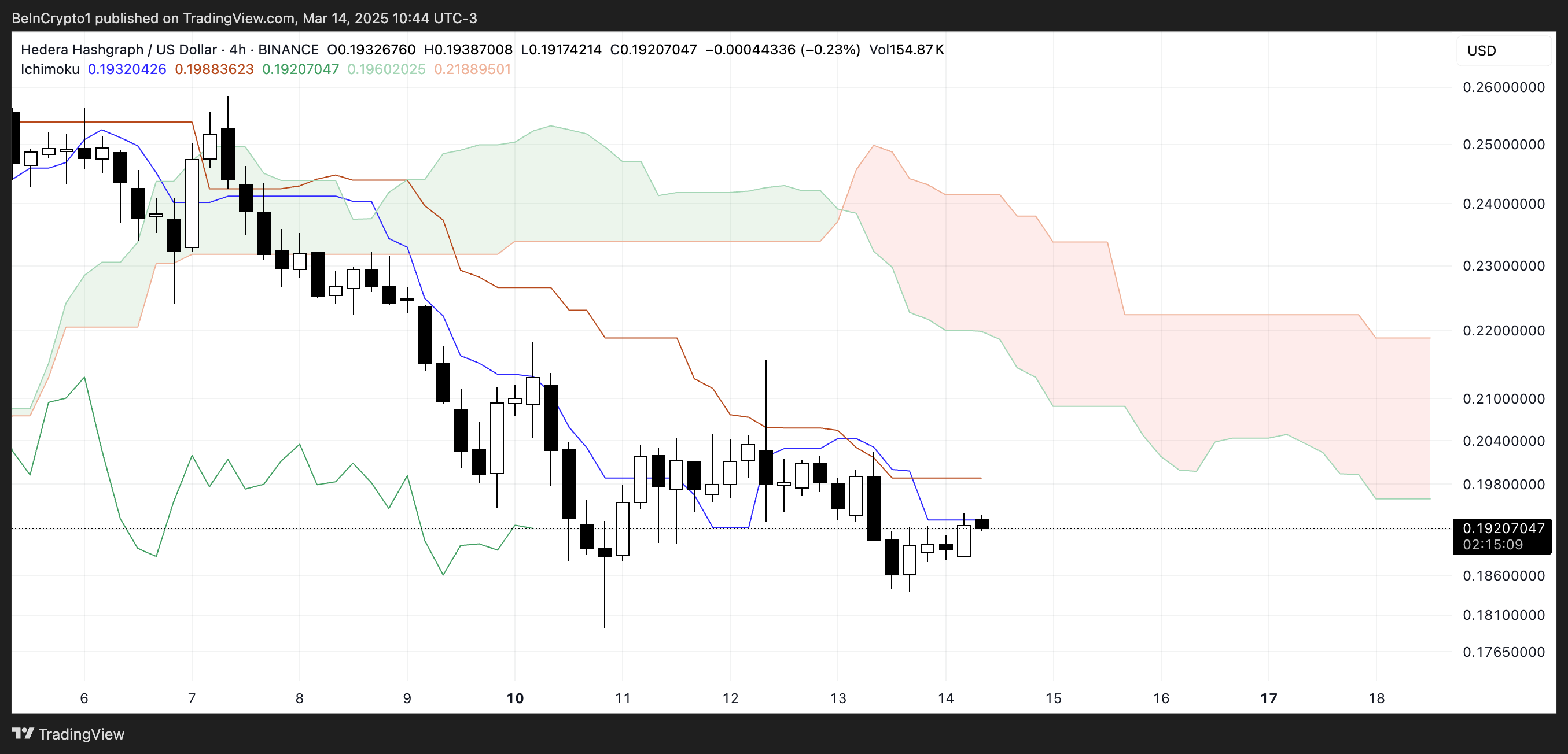 헤데라의 일목균형표 분석은 지속적인 약세 추세를 보여주며, 가격이 구름 아래에서 거래되고 있으며, 구름 자체가 다가오는 세션에서 빨간색으로 변하고 있습니다.