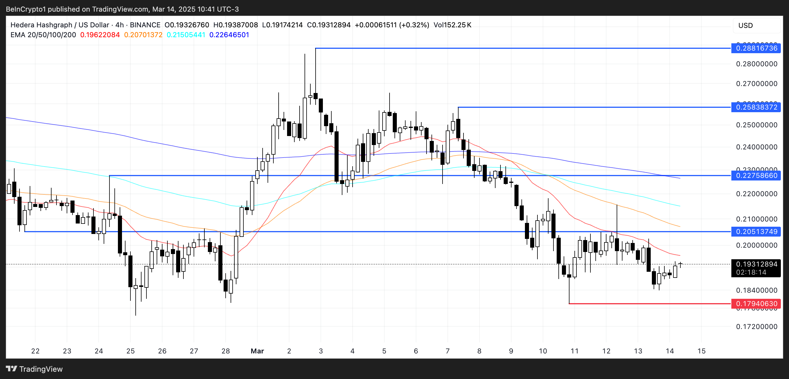 헤데라(HBAR), 3월에 0.17달러 아래로 하락할까?