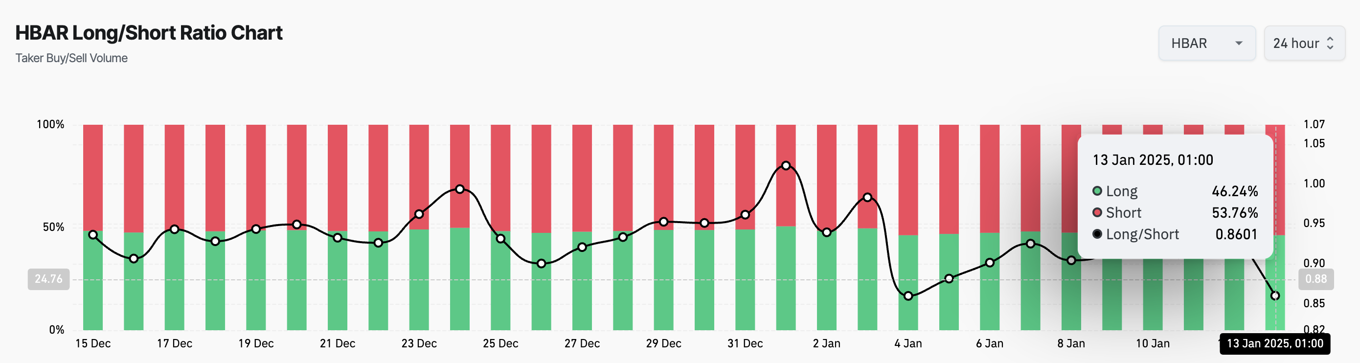 코인글래스(Coinglass)에 따르면, HBAR의 롱/숏 비율은 현재 0.86입니다. 이 비율은 시장에서 롱 포지션(가격 상승을 기대하는 베팅)과 숏 포지션(가격 하락을 기대하는 베팅)의 비율을 측정합니다.