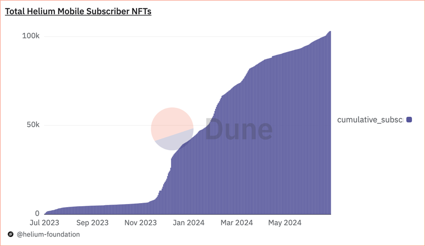 최근 헬륨 모바일은 모바일 구독자 10만 명을 돌파하며 중요한 이정표를 달성했습니다. Dune 대시보드의 최신 수치에 따르면 총 103,081명의 가입자가 있습니다. 또한, 지난 한 달 동안 대체불가능 토큰(NFT)으로 표시되는 월간 구독자 수가 8% 증가했습니다.