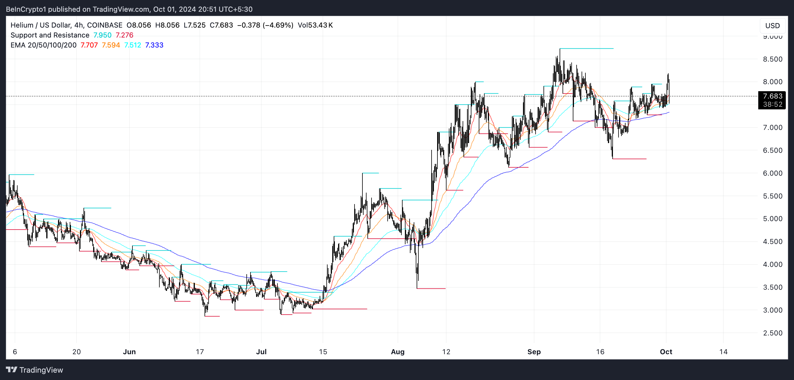 현재 EMA 설정은 상승 잠재력을 나타내지만, HNT는 8.00달러 수준에서 저항을 받으며 이 중요한 장벽을 돌파하는 데 어려움을 겪고 있습니다. 만약 이 저항을 돌파할 수 있다면, 10%의 상승 가능성을 제공하는 8.70달러까지 상승할 수 있습니다.
