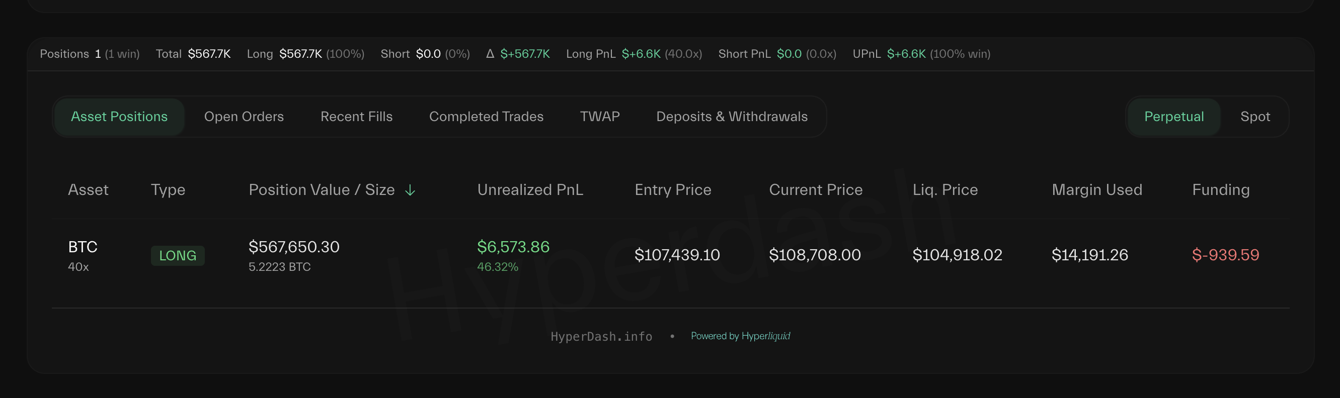그의 최신 롱 BTC 포지션은 6573.8달러의 미실현 이익을 보여줍니다. 이는 이전에 8700만 달러의 이익을 완전히 잃은 것과 대조적입니다.