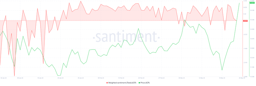 이러한 성과 외에도 알트코인은 랠리에도 불구하고 여전히 추가 가격 상승에 대해 낙관적인 투자자들로부터 상당한 지지를 받고 있습니다. 이는 글을 쓰는 시점에 강세를 보이고 있는 ICP 보유자들의 가중치 정서를 통해 알 수 있습니다.