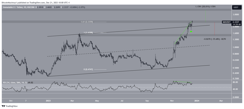 주간 차트와 마찬가지로 일간 차트에서 IMX 가격 움직임도 강세 신호를 보이고 있습니다. 급격한 상승으로 인해 12월 11일에는 오름차순 병렬 채널에서 돌파했습니다. 그 후 12월 18일 IMX 가격은 채널을 지지선으로 확인 했습니다(녹색 아이콘).