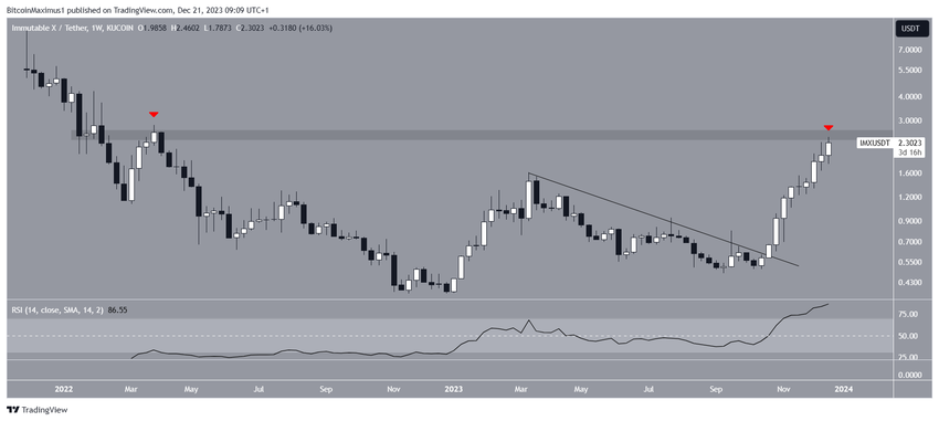 그 이후로 IMX 가격은 10번의 연속적인 주간 상승 캔들스틱을 형성했습니다. 이 알트코인은 사상 최고가인 9.50달러를 기록하기 전 마지막 장기 수평 저항 영역 내에서 거래되었습니다. 오늘 연중 최고가인 2.46달러를 기록했으며, 이는 2022년 3월 이후 가장 높은 가격입니다.