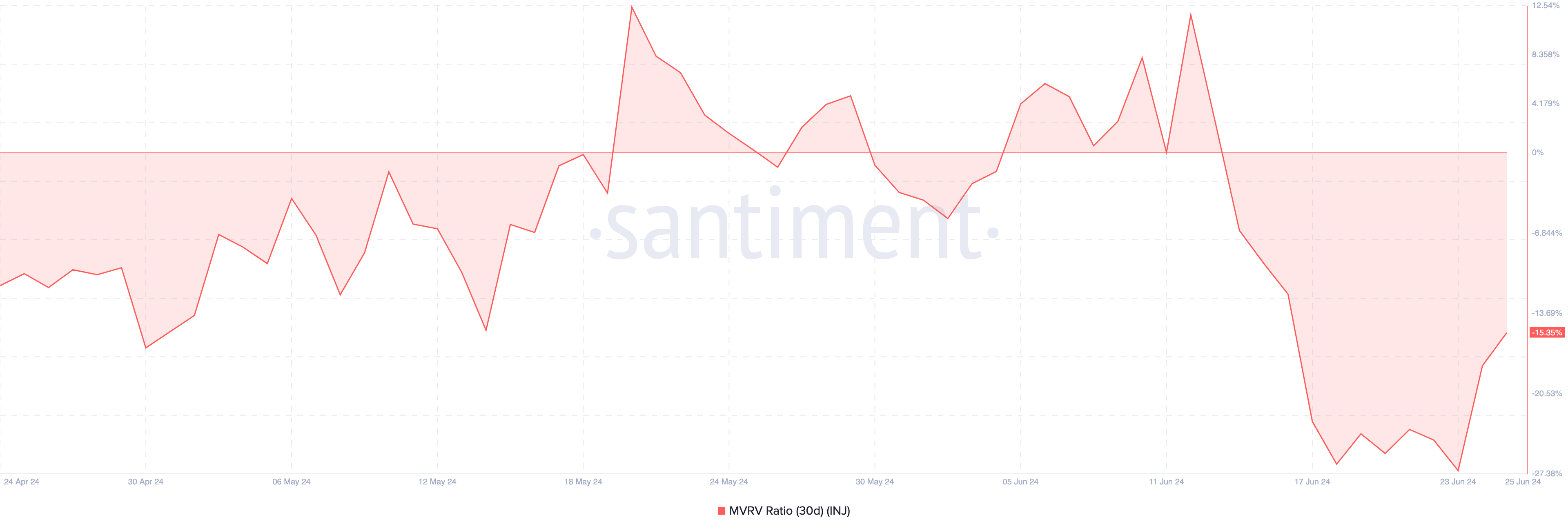위에서 볼 수 있듯이 인젝티브의 30일 MVRV 비율은 15.35%입니다. 일반적으로 INJ 보유자는 낮은 수익성을 고려해 매도를 자제해야 합니다. 그러나 이 비율은 7월 23일보다 높기 때문에 일부 보유자의 미실현 손실이 감소했음을 나타냅니다.