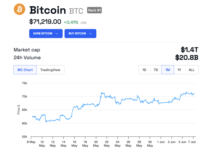 이러한 자금이 유입되는 가운데 비트코인 가격은 소폭 상승했습니다. 현재 약 71,219달러에 거래되고 있으며, 지난 24시간 동안 0.41% 상승했습니다.