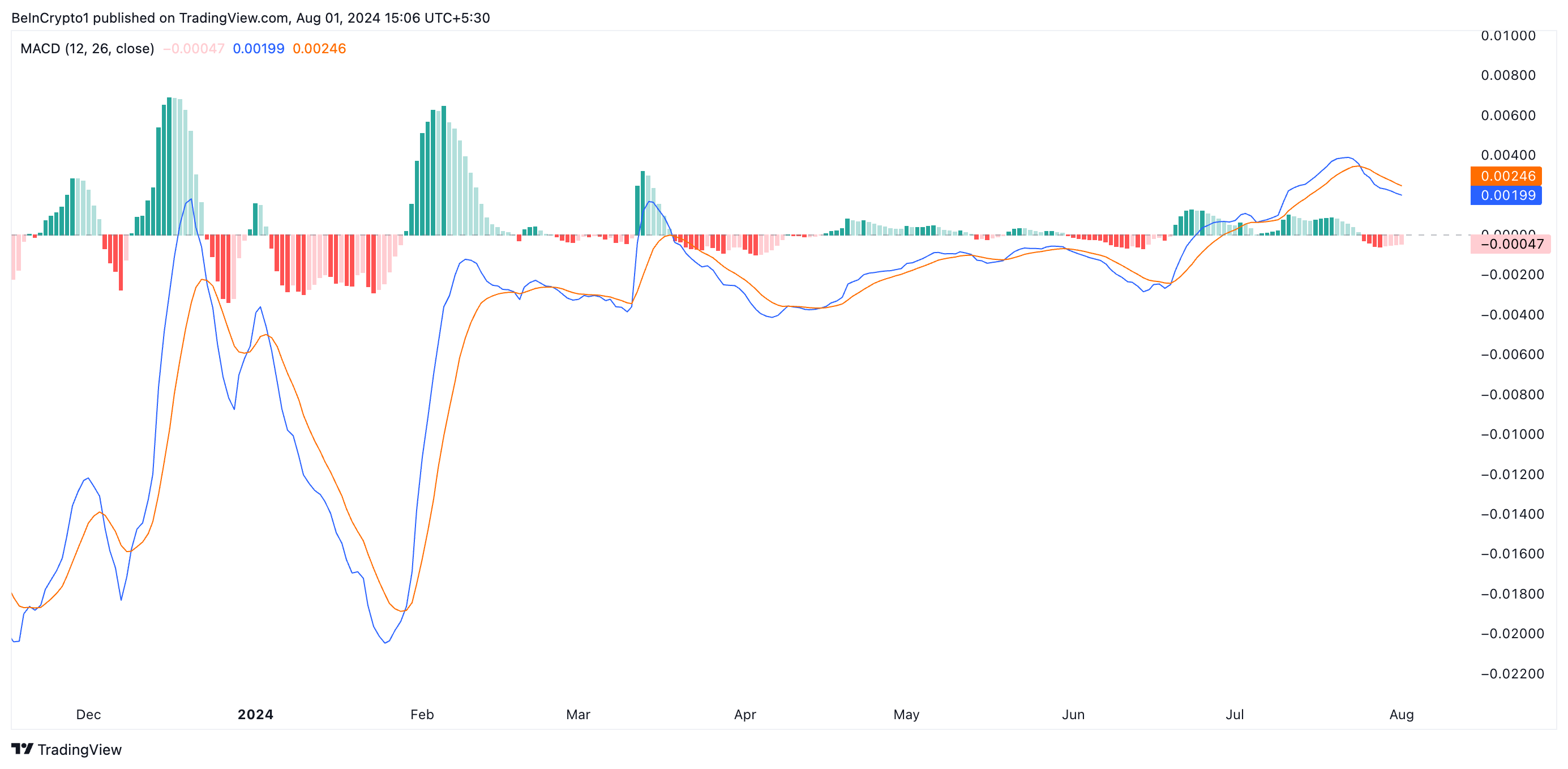 ISLM의 이동평균 수렴/발산(MACD) 지표 수치에 따르면 하락세가 시장 주도권을 되찾았습니다. 이는 7월 24일에 신호선(주황색) 아래로 교차한 MACD 선(파란색)을 통해 확인할 수 있습니다.