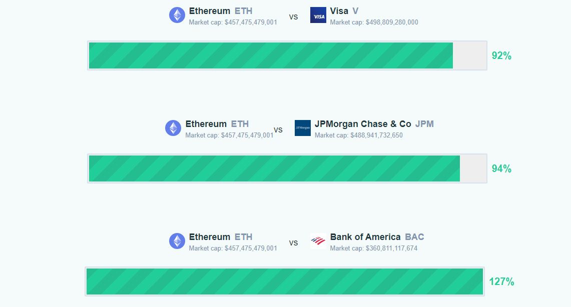 신고가를 경신한 이더리움의 시가총액은 비자와 JP모건 체이스를 넘어섰다.