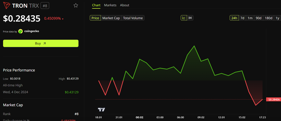 트론의 TRX 토큰은 현재 0.2843달러에 거래되고 있습니다. 지난 24시간 동안 가격이 0.5% 소폭 하락했습니다.