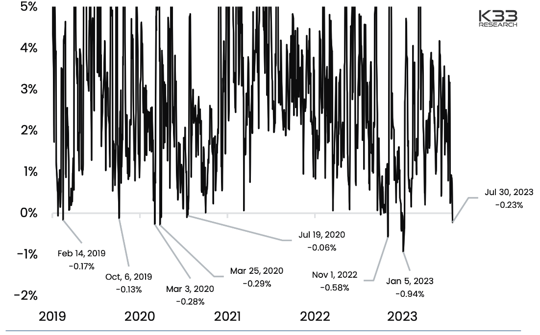 베틀 룬데 K33 수석 애널리스트는 보고서에서 “시장 변동성 압력이 곧 최고조에 달할 것”이며 “폭발이 임박했다”고 전망했다. 그는 변동성을 일으킬 수 있는 요소로, 아크 21셰어즈와 블랙록 등이 신청한 현물 비트코인 상장지수펀드(ETF)의 결과와 미국 증권거래위원회(SEC)와 여러 암호화폐 기업 간의 소송 등을 예시로 들었다.