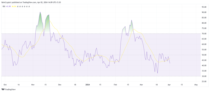 가격 움직임의 속도와 변화를 측정하는 모멘텀 측정지표인 상대강도지수(RSI)가 약세를 보이고 있습니다. 이 지표는 현재 50.0으로 표시된 중립선을 돌파하지 못하고 지지선으로 전환하지 못한 채 중립선 아래에 있습니다.