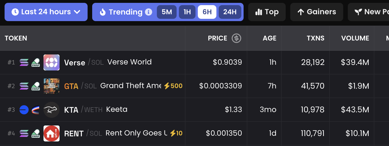 지난 24시간 동안 여러 주요 정치 밈코인이 화제가 되었습니다. 예를 들어, 그랜드 테프트 아메리카는 로스앤젤레스 ICE 시위와 GTA 비디오 게임 시리즈를 패러디한 것으로, 지난 몇 시간 동안 60만 달러를 기록했습니다.