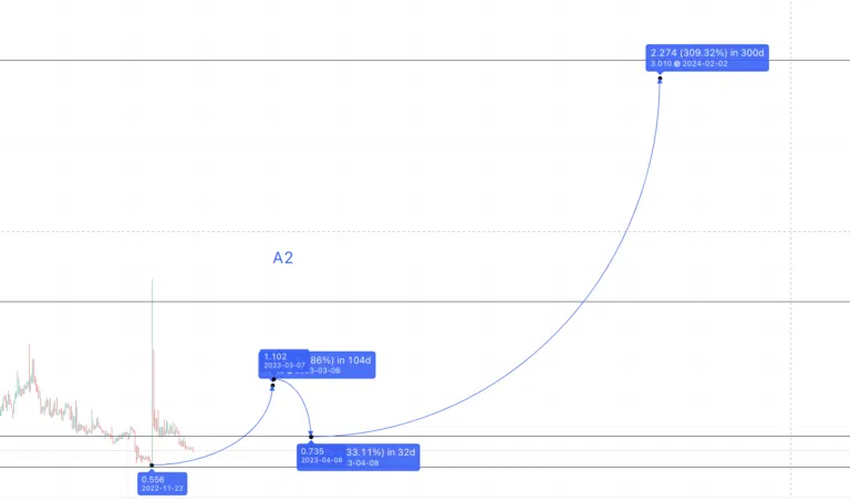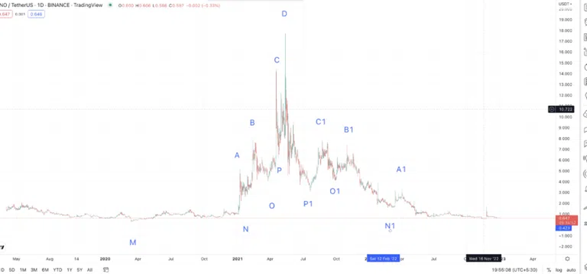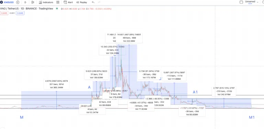 경로를 그렸을 때 XNO의 가격이 A1 이후 평균 저점에 아주 근접했다는게 나타난다. 이 지점에 성공적으로 터치했다는 것은 우리의 나노 가격 예측이 올바른 방향으로 나아가고 있다는 것을 나타낸다. 한편, XNO의 가격은 0.546달러로 떨어졌다.