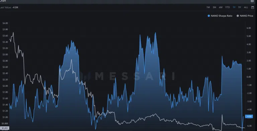 투자 관점에서 나노(XNO)를 바라볼 때 샤프 비율(sharp ratio, 변동성과 수익률 사이의 비율. 샤프 지수라고도 함)를 살펴보는 것이 중요하다. 이 비율은 나노의 위험과 관련하여 시간 경과에 따른 상대적 수익률을 측정한다. 쉽게 말해 1 이상이면 좋은 것이다.