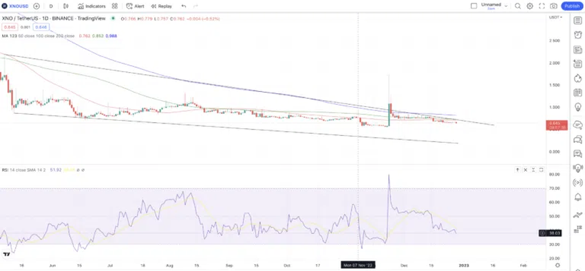 - 일간 차트에 따르면 XNO는 폴링 웻지(falling wedge 하강쐐기) 패턴 안에서 거래되고 있다. 이는 노란색 선(50일 이동 평균)이 100일 이동 평균 선(녹색) 위를 통과할 경우 강세로 바뀔 수 있다.