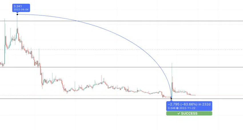 이제 A2에서 N2로 다음 선을 그어야 한다. 수준은 0.505달러이다. 다만 XNO의 최저가가 될 수 있는 0.737달러로 매우 강력한 지지선이 있다.