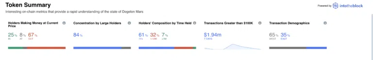 시가총액 추이를 보면, 도지론 마르스의 시가총액은 2021년 10월 고점인 12억1000만 달러 이후 크게 감소했다. 하지만 현재 저점은 토큰 출시 몇 달 후의 기록인 사상 최저점을 훨씬 웃돌고 있다.