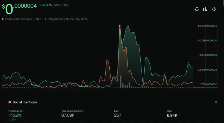 ELON의 가격은 소셜미디어 상의 과대광고(hype)와 직접적으로 연관된다. 일론 머스크가 공식적으로 트위터를 인수한 지난 10월 27일 경에 소셜 멘션(social mention 소셜미디어 플랫폼 등에서 특정 이슈, 이름 등이 자주 언급되는 것)이 급증했다.